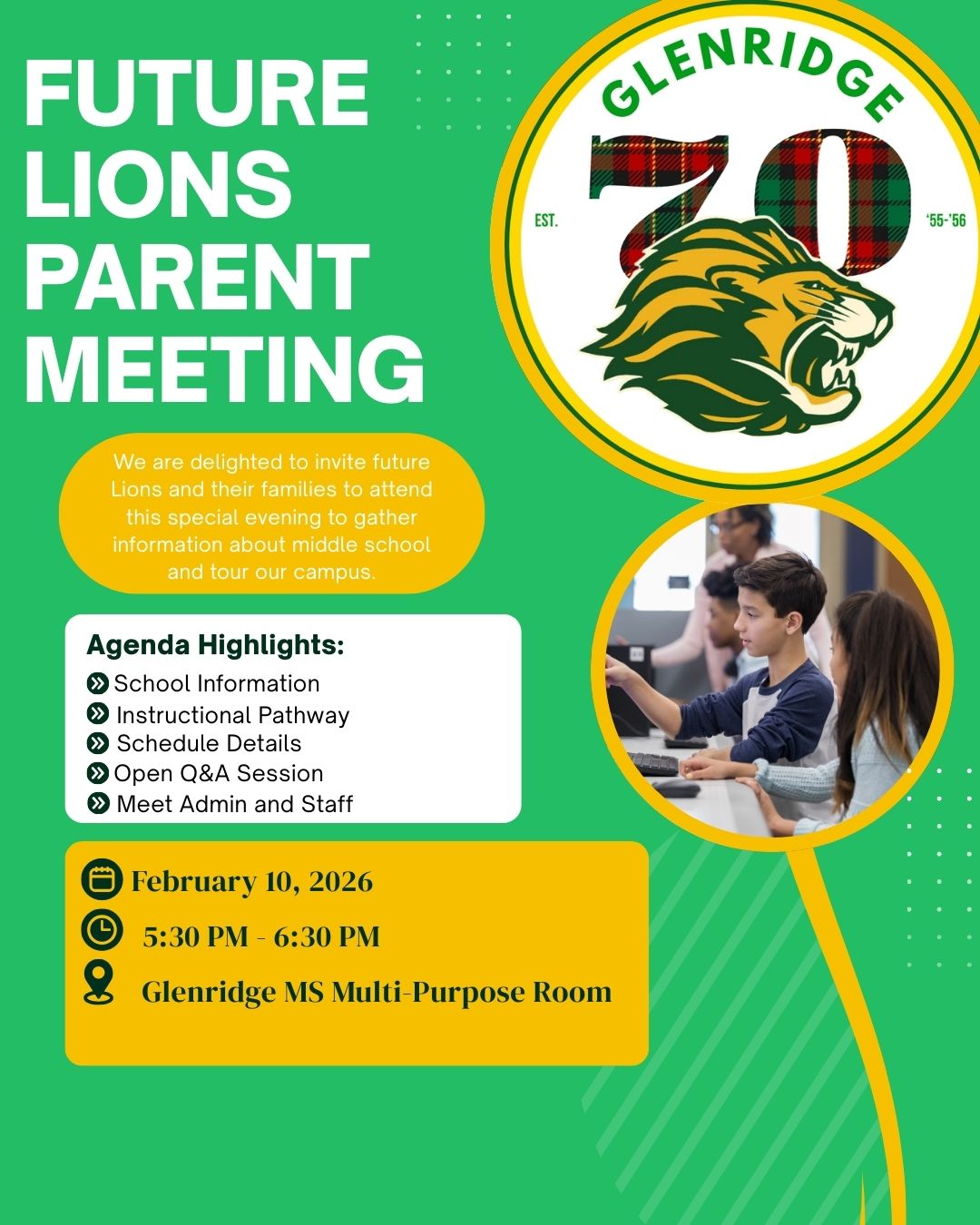 Welcome to Glenridge Middle School, home of the Lions. We have a rich tradition in OCPS as our inaugural year dates back to 1955. I am extremely proud to lead the staff and students at one of OCPS's finest middle schools. The 2025-2026 school year will mark my 5th year as principal and 7th year as an administrator at Glenridge. Our school aligns the district vision of ensuring that every student has a promising and successful future by providing opportunities and access to rigorous coursework and expansive elective choices. We pride ourselves in our ability to approach the whole child as they navigate their middle school years. As a middle school, we have a limited time- 540 days, to prepare our students to succeed in high school, and we consider each one of them important. As we embark on our 70th year, I am confident that we will meet our district objectives while providing each student with an enriched experience.